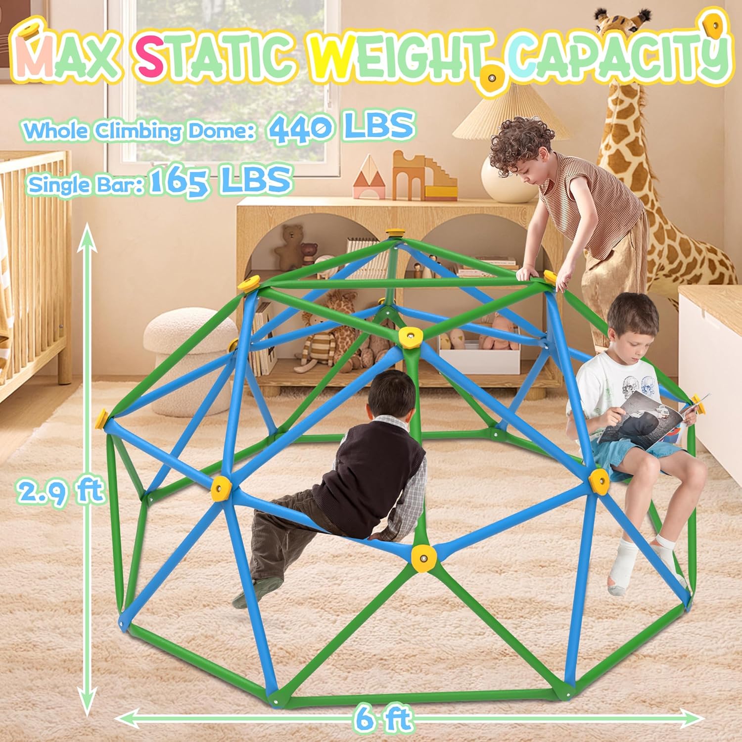 This 6FT dome climber is more than a toy—it’s a way to get kids off screens and moving. The 440LBS capacity lets siblings and friends play together, while the anti-rust steel ensures years of use. ASTM certification gives parents peace of mind, and the dual-use design works whether you have a big backyard or limited indoor space. It’s the perfect gift for kids aged 3-8 who love climbing, exploring, and burning off energy.